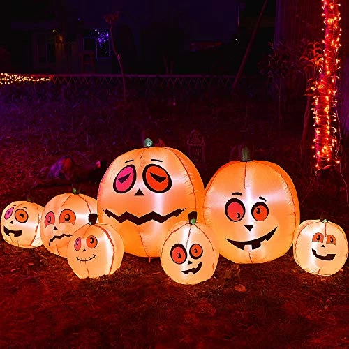 Halloween Inflatable Pumpkins: The Halloween Lighted Inflatable Pumpkins are an indispensable Halloween decoration, the 8FT Long Inflatable Pumpkins with several LEDs lights built inside, this blow up Halloween decorations. The cute 7 Pumpkins are giving off an orange glow, emit a terrifying color, creating a terror atmosphere.