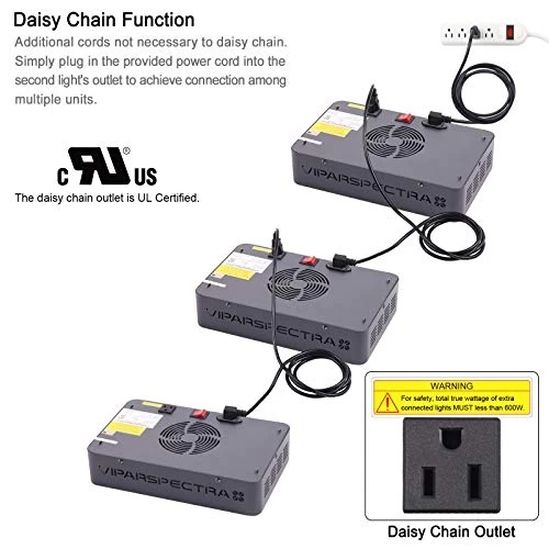 【Outstanding Design】Sturdy durable construction with fire-resistant iron housing. Suitable for each growing phase. Upgraded aluminum cooling heat sinks and advanced high speed quiet fans are great for heat dissipation. Daisy chain feature assists growers to connect multiple lights together with fewer outlets.