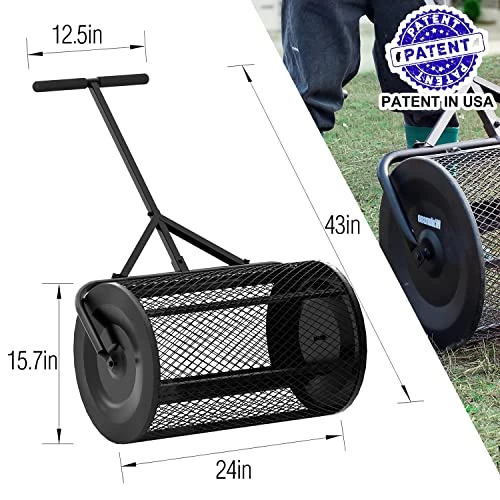 Walensee 24 Inch Compost Spreader Peat Moss Spreader With Upgrade T Shaped Handle For Planting Seeding Durable Lightweight Metal Mesh Spreader For Lawn And Garden Care Manure Spreaders Roller Patented