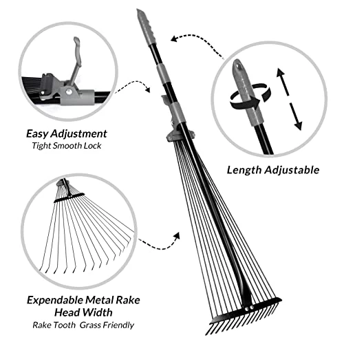 ADJUSTABLE DESIGN: Walensee leaf rake provides double regulation design and can be adjusted the handle length by rotating, you can choose the expansion size from 7 inch to 22 inch according to different scenes by turning the buckle. The width of the 15 tines is 22 inch and lock in any position in between, efficiently collect the leaf without bending again and again. The total length of the rake is 64″, collapsed size: 32″. The rake can be locked any position in between.