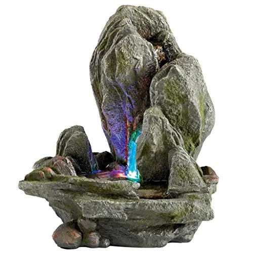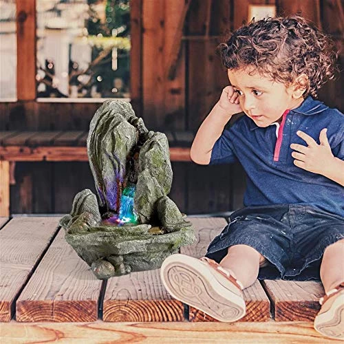 Our boulder falls cascading garden fountain is part of Design Toscano “small Wonders” Collection of tabletop fountains, perfectly sized to be placed anywhere, from a deck to a patio table – or bring the sweet sound of water music inside on a desk or in the bedroom. A cascading waterfall flows down into a rock pool to create an in-home oasis & peaceful, natural atmosphere. With the basin pool highlighted by an included multicolor LED light kit, you can even enjoy this garden fountain in the evening. It can be placed indoors or out & constantly recycles water from a hidden reservoir. Cast in quality designer resin & hand-finished to replicate a cluster of natural stones, this garden fountain also features a UL-listed indoor/outdoor pump. A special size Priced for any budget, Our “small Wonders” Fountains will make a delightful gift for yourself or a friend. Simple assembly required. 12″Wx8″dx14″h. 7 lbs.