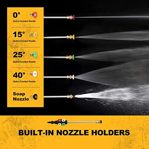 【YOUR ALL-PURPOSE CLEANING ASSISTANT】5 quick-connect spray nozzles are included so you can get the desired spray angle; a 0° nozzle for spot cleaning or hard-to-reach areas, a 15° nozzle for tough jobs, a 25° nozzle for all-purpose cleaning, a 40° nozzle for cleaning windows and screens, and a soap nozzle for foam spraying