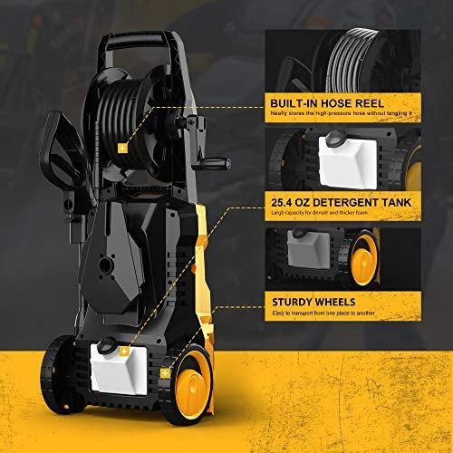 【UPGRADED DESIGN】A 20-foot high-pressure hose and a 35-foot power cord allow for flexible use in large areas; built with an ergonomic handle and 2 sturdy wheels for easy and comfortable transportation; the reel holds the high-pressure hose neatly without tangling, built-in nozzle holders on the spray lance store the nozzles, and the spray gun holder on the pressure washer holds the spray gun