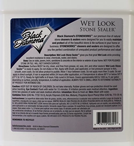 Wet Look Sealer from Black Diamond Stoneworks seals and provides a beautiful gloss finish. Treating your pavers, stone, slate, concrete, brick, driveways and garage floors with WET LOOK SEALER will make them look and shine beautifully. WET LOOK STONE SEALER is the one product you will need for INTERIOR or EXTERIOR applications to beautify and protect. Wet Look Sealer provides excellent resistance to wear, chemicals, water and UV rays. Adds shine and protection to slate, natural stone, pavers and all other masonry surfaces! WILL NOT DARKEN SURFACE. Durable, clear and non-yellowing. Water clean-up makes Wet Look Sealer easy to use. Wet Look Gallon Covers approx. 600 sq Ft. Wet Look Sealer is a part of Black Diamond’s STONEWORKS’ line. This is our premium line of natural stone cleaners & sealers. They are designed to help you easily maintain and protect all of the surfaces in your home or business. STONEWORKS cleaners and sealers are designed to offer you the perfect combination of unequaled product performance and value! Made in the USA. Designed, Tested and Used by Stone and Tile care Professionals!