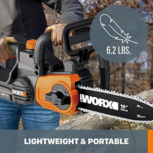 WORX 10″ cordless chain saw boosts the 20V Power share platform with innovative technology. The patented tool-free auto chain tension system prevents over tightening & keeps optimal chain tension while cutting. Combined with an automatic oiling system with indicator & a compact design allows this saw to be practical in any quick clean up or pruning task.