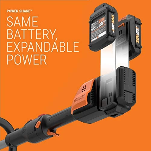 The 13″ WORX WG184 combines two 20V Power Module batteries to deliver 40V Power and Performance. With the ability to quickly switch between trimming and in-line wheeled edging this 2-in-1 design can provide professional looking results to any yard. Unlike conventional trimmers the WG284 boasts an innovative line feed mechanism that feeds 1/4″ of line instantly at the click of a button. No bumping or waiting for auto-feed solutions. With various ways to adjust the trimmer to any job, this trimmer/edger can easily manage any home site up to a 1/2 acre. Being a part of the 20V Power Share program allows endless possibilities to share batteries with many other tools.