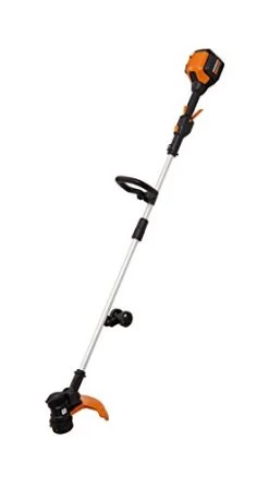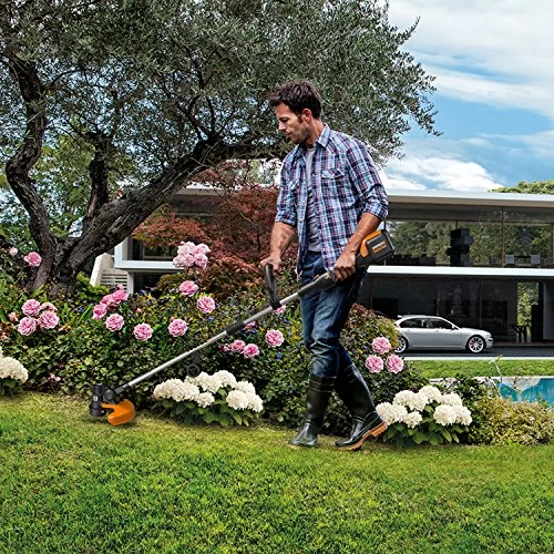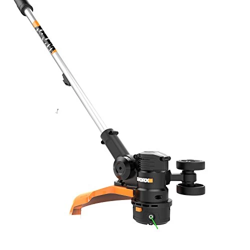 The WORX WG191 56V Max Li-Ion 13-Inch Cordless Grass Trimmer features a new Command FeedTM system that allows instant trimmer line advancing – no more bumping or waiting for the line to advance before cutting. With Command FeedTM, the user electronically controls when to feed more line through a simple push-button above the trigger. This not only conserves line, it eliminates downtime when edging and waiting for additional line to advance. This trimmer uses a thicker professional-grade trimmer line (.080” diameter, 1” x 20′ in length) that’s more durable than conventional line. WORX incorporates a quick-change, easy-to-load, pre-wound spool accessory, so there’s no fumbling with line changes. The WG191 also has a new method to switch from trimming to edging – the push-button feature delivers a seamless transition between functions by simply pressing a button at the top of the shaft and twisting. The WG191 comes with a set of twin wheels that help guide the tool while edging, wheels that can be removed and housed on the lower shaft to give you full visibility while trimming. The head pivots from 0 to 90 degrees to provide any angle needed for trimming and edging.