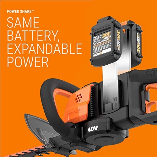 The 24″ WORX WG284 combines two 20V power module batteries to deliver 40V power & performance. At 9.3 lbs., this performance-minded green Machine weighs considerably less than comparable gas models. Being a part of the 20V power share program allows endless possibilities to share batteries with many other tools. The rotating cutting head & ergonomic design allows for quick transitional cuts. Whether it’s used for shaping tasks or topiary sculpting, the WG284 with a 3/4″ cutting capacity, has plenty of power to get the job done. A clear-view, hi-impact hand guard angled in front of the handle provides protection & helps deflect debris. The stamped-steel, smooth-cutting, dual-action, 24 in. Blades minimizes vibration & reduces operator fatigue, especially during extended use periods.